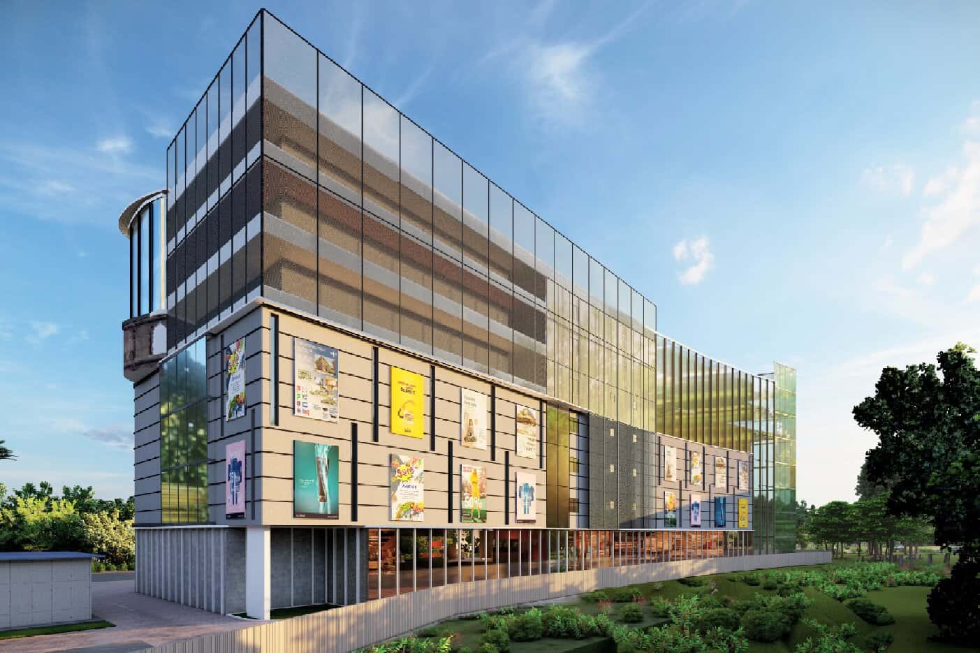 The curved facade and sweeping wave-like entrance canopy create a dynamic, elegant look. The grand entrance leads to a triple-height atrium with interactive landscaping and an amphitheatre space.