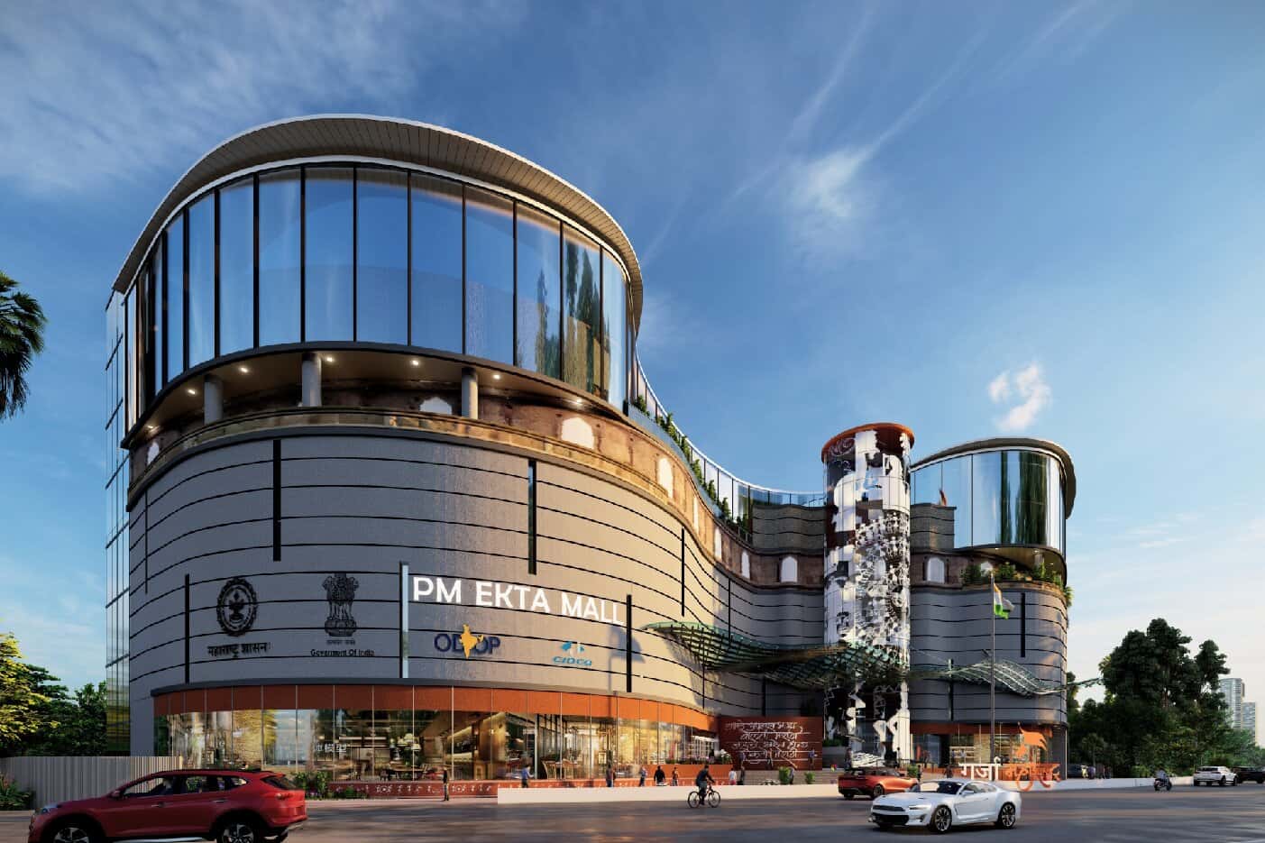 The PM Ekta Mall is a national platform aimed at promoting the 'One District One Product' and 'Make in India' initiatives, showing a diverse range of products from each district, empowering local artisans and entrepreneurs. The proposed mall is a fusion of classic Maharashtrian architectural styles with modern design elements, incorporating arches and vertical slits, as well as contemporary glazing, canopies, and aluminium fins. The mall aims to celebrate India's rich cultural heritage while also promoting economic growth.